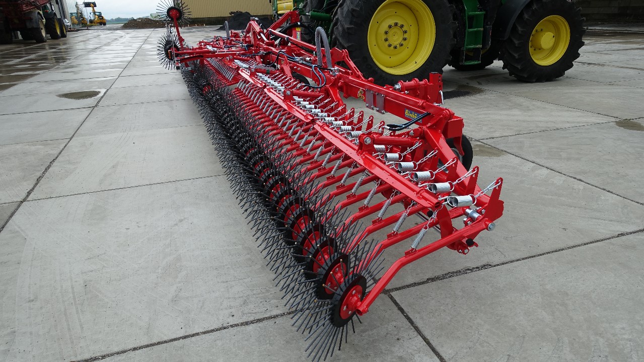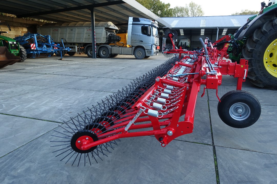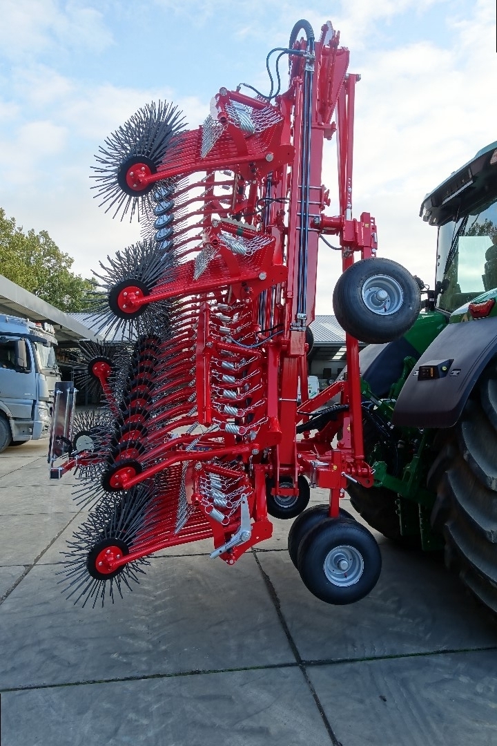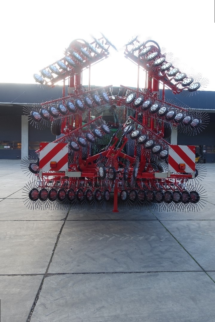 Largeur de travail: 12m; 8 compartiments de 1.50m; 4 roues de terrage 16x6.50R8 voie réglable 1.36 à 2m; 40 étoiles Ø 500mm avec dents Ø 6.5mm; Passage entre dents: 15cm, Réglage de l'agressivité hydraulique; Barre attelage cat II; Béquille; Châssis robuste; Largeur de transport 3m; Poids:1890kg