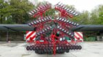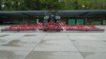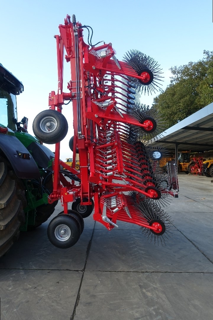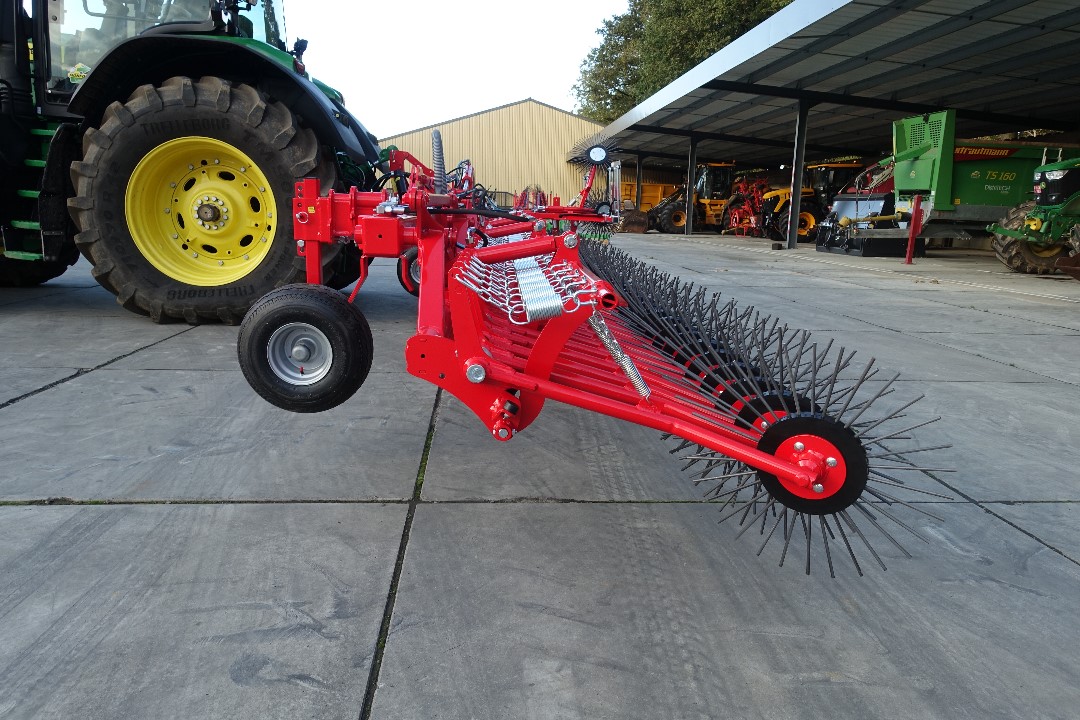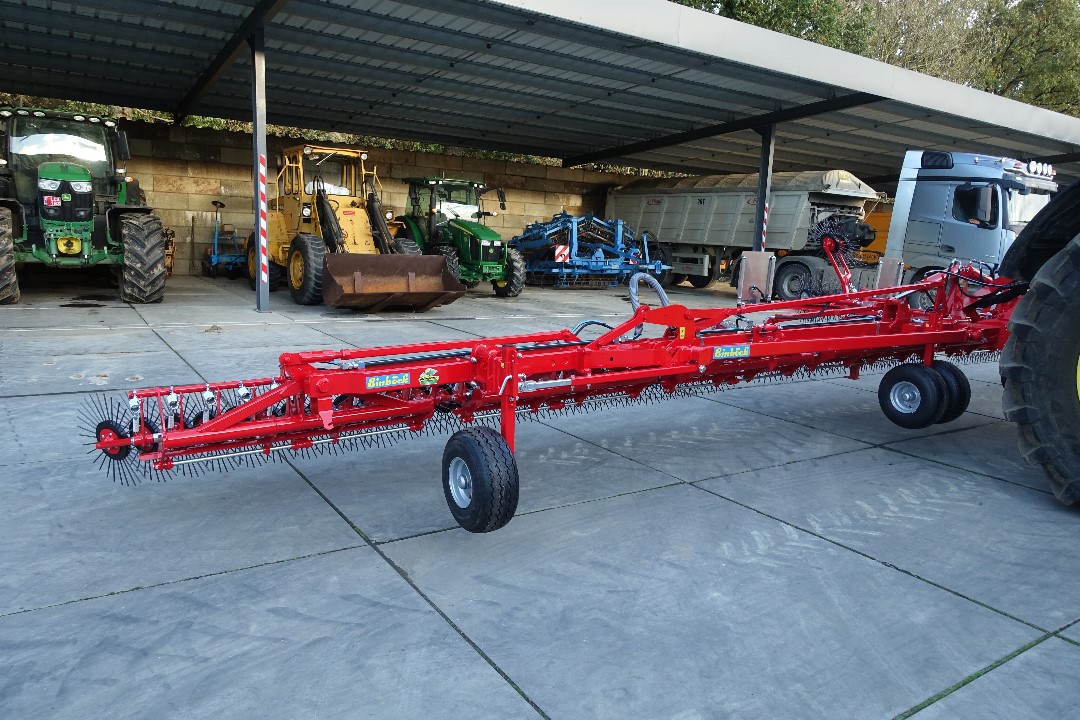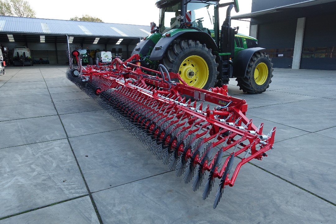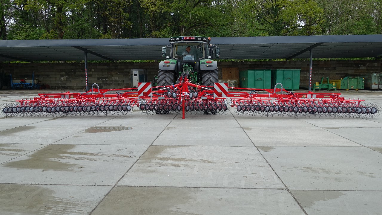 Largeur de travail: 12m; 8 compartiments de 1.50m; 4 roues de terrage 16x6.50R8 voie réglable 1.36 à 2m; 40 étoiles Ø 500mm avec dents Ø 6.5mm; Passage entre dents: 15cm, Réglage de l'agressivité hydraulique; Barre attelage cat II; Béquille; Châssis robuste; Largeur de transport 3m; Poids:1890kg