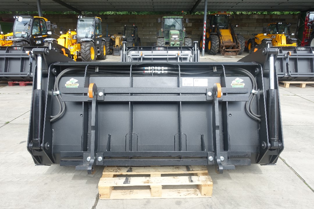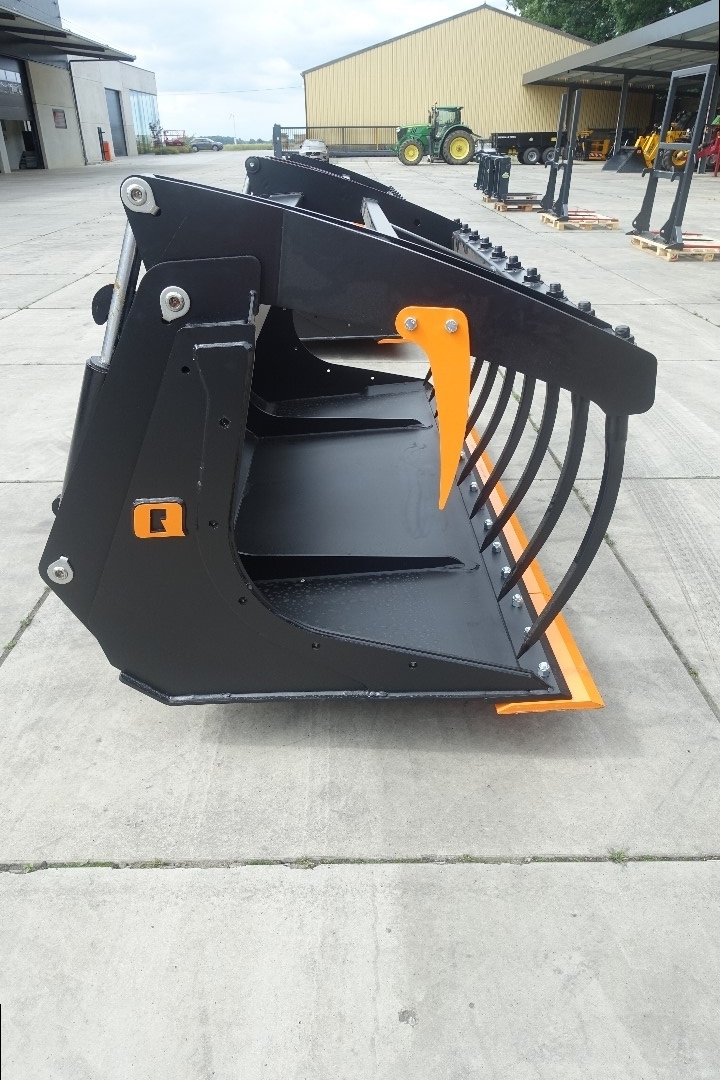 Largeur: 2.50m; Profondeur: 116,5m; Hauteur: 80cm; Capacité: 1.85m³; Poids: 932kg; Lame boulonnée: 25x2.5cm; Dents forgées boulonnées:10; Oreilles boulonnées type B: Qfit, crochets boulonnés Rail L