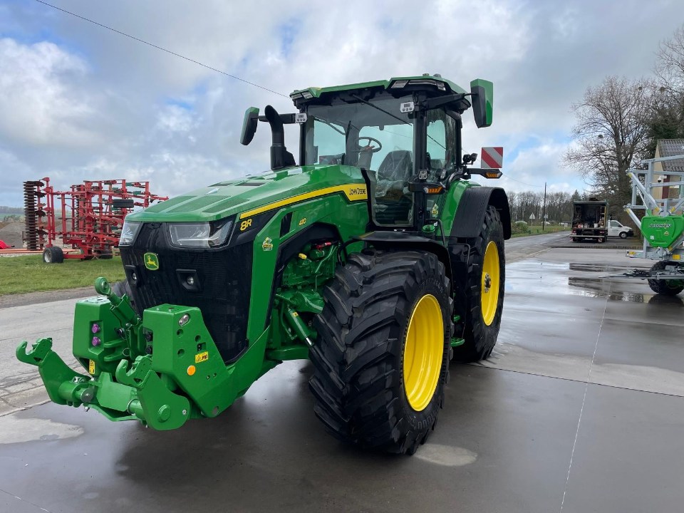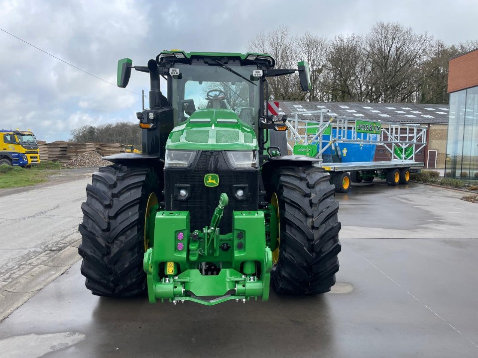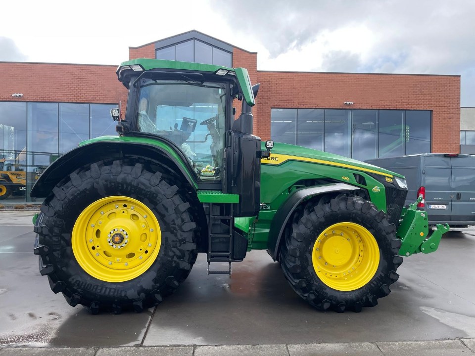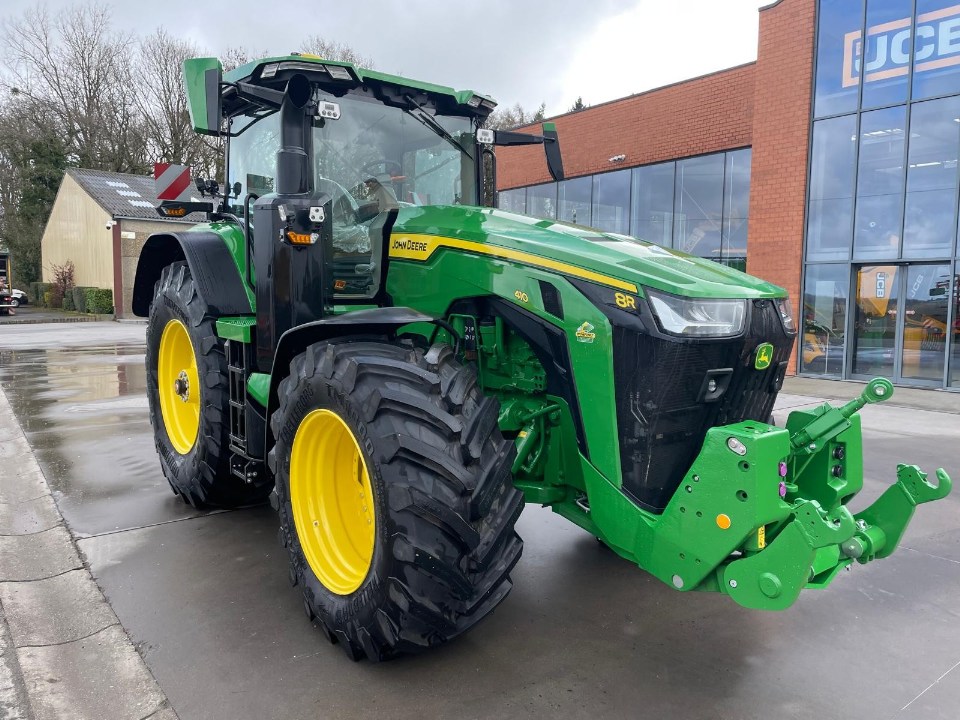 Puissance nominale du moteur (ch selon ISO): 410ch; MOTEUR: Système d'arrêt automatique; Filtre à air sec avec élément de sûreté et système d'aspiration des poussières; Capot moteur relevable; Ventilateur à entraînement visco; Filtre à carburant et préfiltre; Séparateur d'eau/carburant avec capteur; Système d'injection de carburant électronique avec purge et amorçage automatiques; Régulateur automatique de régime FieldCruise™; Capuchon du réservoir de carburant verrouillable; TRANSMISSION: Embrayage à disques humides à commande hydraulique; Frein de stationnement intégré; Système de sécurité au démarrage; DIRECTION ET FREINS: Système hydraulique à signal de charge; Freins à disques humides, à commande hydraulique assistée par servo frein; Blocage du différentiel arrière à commande hydraulique sélectionnable (modes manuel/automatique); CIRCUIT HYDRAULIQUE: Pompe à pistons axiaux à pression et débit optimisés; Raccords de sécurité ISO de type push-pull et leviers de décompression; PRISE DE FORCE: Système de sécurité au démarrage de la prise de force; Avertissement de prise de force activé par le siège; Garant de prise de force; ATTELAGES ET BARRES D'ATTELAGE: Attelage 3 points à commande électronique; Contrôle d'effort électronique; Bras de relevage fixes; Amortissement de l'attelage; Hitch Dampening™; Poignée de réglage de la barre de poussée; Poignées de réglage des bielles de relevage droite et gauche; Support de masse frontale avec point d'arrimage intégré; PLATE-FORME DE CONDUITE ET COMMANDES: Tableau de bord numérique sur montant d'angle, avec indicateur de température du liquide de refroidissement moteur, indicateur du niveau de carburant avec alarme de niveau bas, indicateur du régime moteur Indicateurs d'état pour pont avant; Blocage du différentiel; Régime de prise de force arrière; Fonction vidéo avec déclencheurs activés par le tracteur; Fonction; Access Manager Moniteur universel pour la machine et le travail; Fonction d'affichage reconfigurable par le conducteur iTEC™ - Contrôle des fonctions de l'équipement et du tracteur Volant inclinable/télescopique avec mémoire de position; Siège avec pivotement de 40 degrés vers la droite; Accoudoir CommandARM™ avec position réglable Vitre arrière ouvrante; Climatisation et chauffage; Régulation automatique de la température; Compartiment de rangement dans le pavillon; Siège passager repliable; Compartiment de rangement à gauche; Deux porte-gobelets; Rétroviseurs extérieurs gauche et droit; Radio avec haut-parleurs, antenne pour bande commerciale et câblage; Rétroviseur dans la cabine; Pare-brise feuilleté insonorisant; Marchepied côté gauche; Patère Marche pied côté droit; Éclairage d'accueil programmable; Marche pied d'accès réglable; Prise multiple avec adaptateur 4 prises de charge USB; Prise électrique 12 V; Tapis de sol en caoutchouc moulé; Clignotants à rappel automatique; Store pare-soleil avant; Essuie-glaces avant et arrière; Commande des ailes arrière côté gauche; SYSTÈME ÉLECTRONIQUE ET ÉCLAIRAGE: Démarrage Tip Start Arrêt du moteur à la clé; Circuit électrique 12 V; Deux batteries 12 V; Bornes pour batterie d'appoint; Alternateur (250 A); Tableau de fusibles; Prise électrique à 7 bornes pour équipement arrière; Connecteur radar ISO intégré; Faisceau d'entrée de vitesse radar ou récepteur StarFire™; Port de données ServiceADVISOR™; Coupe-batterie; Feux stop, phares de travail, phares principaux; Clignotants et feux de détresse; CONSOLES, RÉCEPTEURS ET SOLUTIONS DE GESTION AGRICOLE: Console CommandCenter™ intégrée Connecteur intégré pour console GreenStar™; Faisceau GreenStar™ Ready avec passerelle de circuit d'équipement et connecteur intégré pour console GreenStar™ (compatibles ISO 11783); Faisceau Ethernet Composants compatibles AutoTrac™: Câblage, contrôleur de direction, capteur d'angle de roue avant et unité de direction électrohydraulique; DIVERS: Avertisseur sonore; Boîte à outils; Livret d'entretien; Les caractéristiques mentionnées sont celles de la machine de base standard uniquement et peuvent différer en cas de commande d'autres options/accessoires