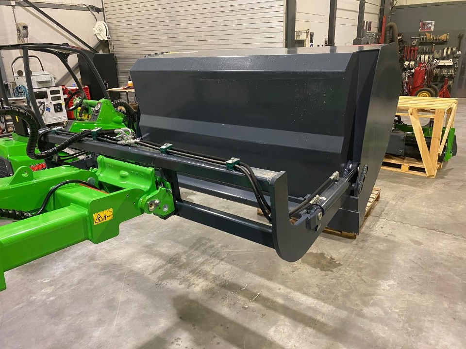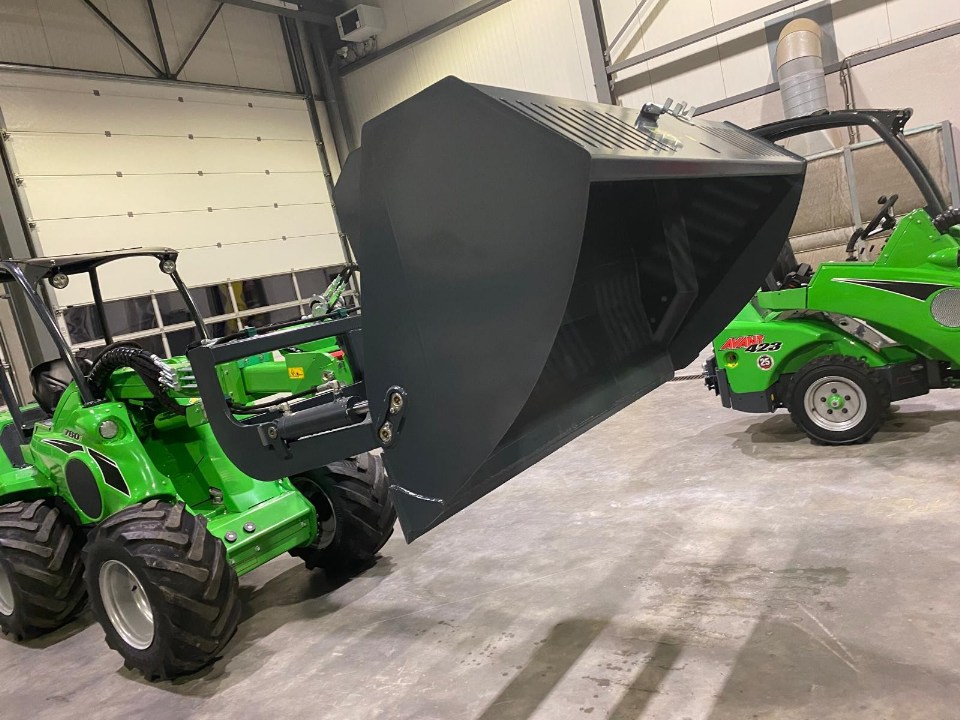 Avec le godet à basculement, vous pouvez charger à une hauteur plus importante. Le godet est équipé d’un vérin hydraulique qui le fait basculer vers l’avant – c’est-à-dire que la hauteur de basculement sur la série 200 est de 1680 mm, sur les séries 400-600, R et e avec bras télescopique d’environ 3100 mm (suivant pneumatiques), sur la série 700 d’environ 3500 mm et sur la série 800 de 4000 mm.
