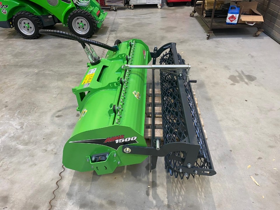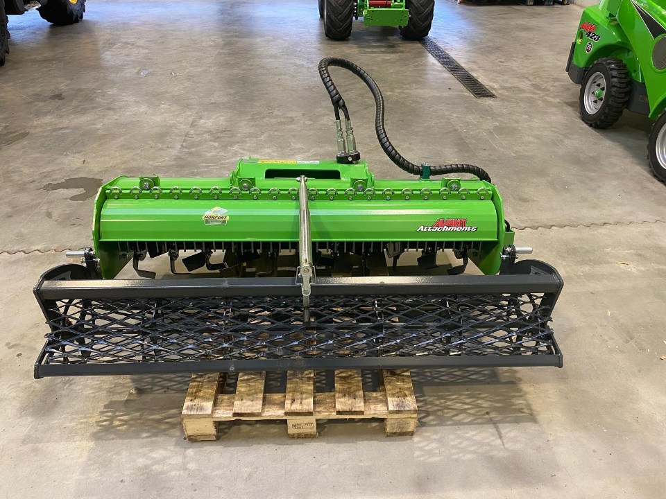 Fraise rotative efficace et professionnelle; Surface parfaitement cultivée en un passage; Entraînement direct avec moteur hydraulique monté directement sur l'arbre; Râteau vertical avec dents robustes qui piége et enfouit les pierres et autres objets; Profondeur de travail réglable avec rouleau de compactage arrière; Lame niveleuse à hauteur réglable entre l'arbre et le rouleau